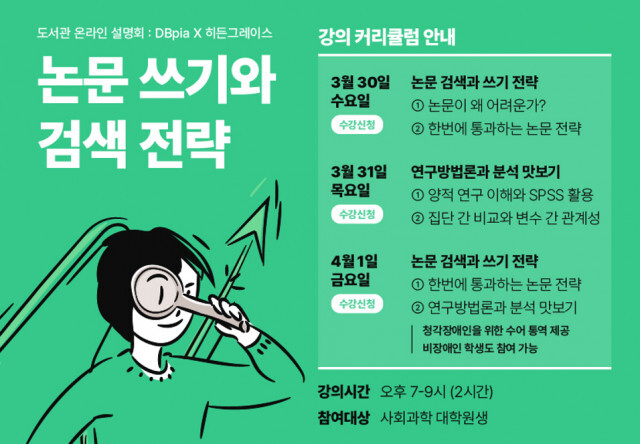 서울--(뉴스와이어) 2022년 04월 11일 -- 누리미디어가 운영하는 최고의 학술 논문 DB, 검색 서비스 디비피아(DBpia)는 업무 협약을 맺은 데이터 분석 전문 사회적 기업 히든그레이스와 함께 청각 장애인 대학원생들을 위한 논문 무료 특강을 4월 1일 진행했다고 11일 밝혔다.