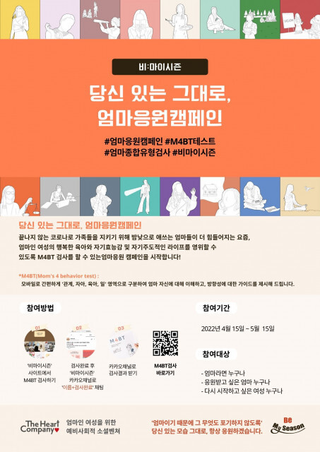 인천--(뉴스와이어) 2022년 04월 12일 -- 밀레니얼 세대 엄마를 위한 커뮤니티, 문화를 만들어가는 스타트업 더하트컴퍼니의 브랜드 비마이시즌이 ‘당신 있는 그대로, 엄마응원캠페인’을 4월 15일부터 5월 15일까지 진행한다.